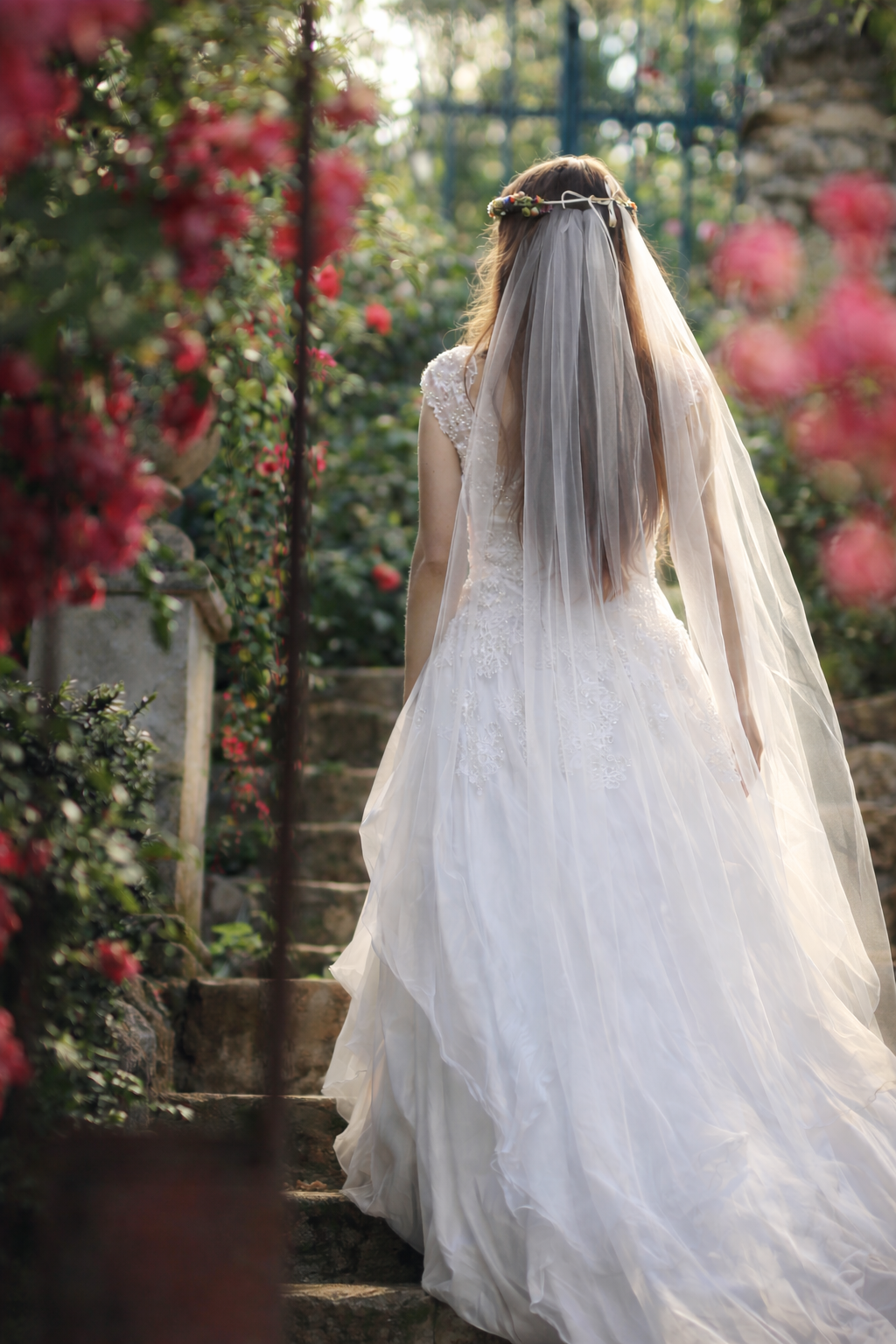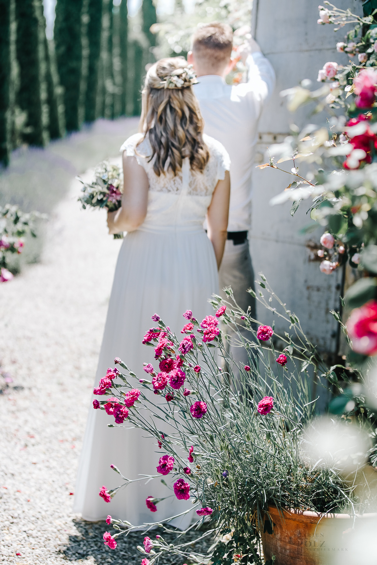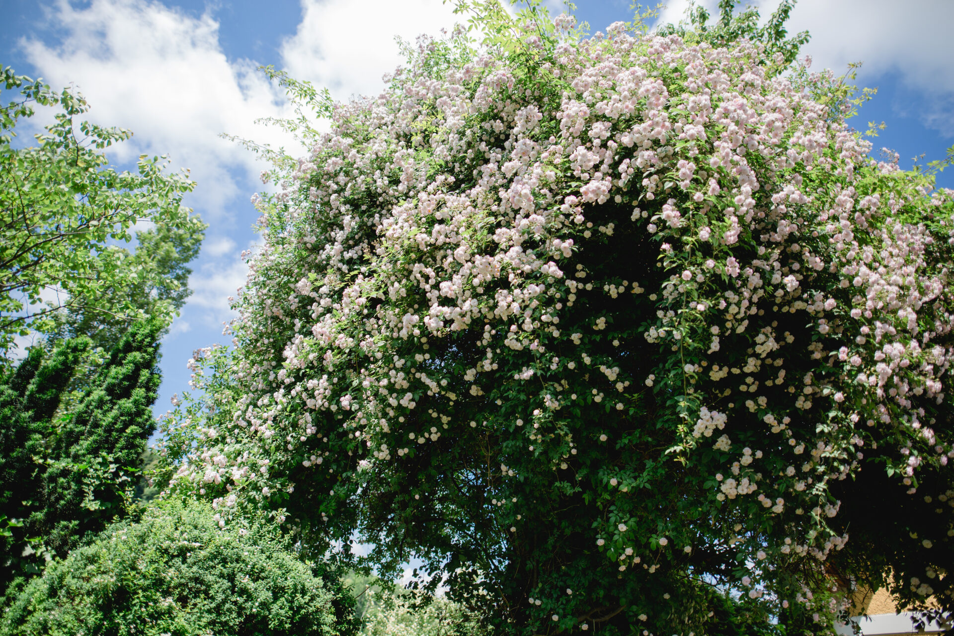 Trotz der Fülle bleibt die Struktur klar. Die Rosen fügen sich in die bestehende Gartenarchitektur ein, ohne sie zu überlagern. Zypressenallee, Stauden und Weingärten bilden weiterhin den ruhigen Rahmen.