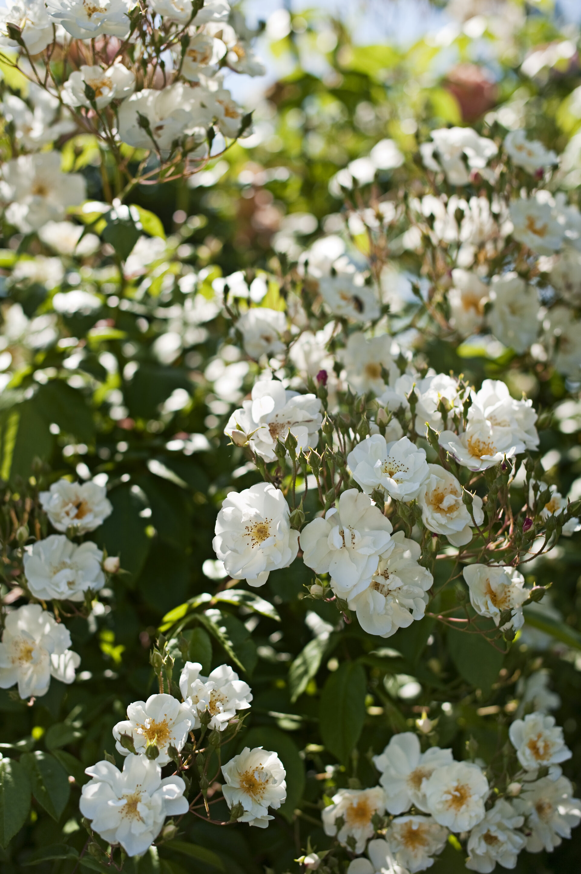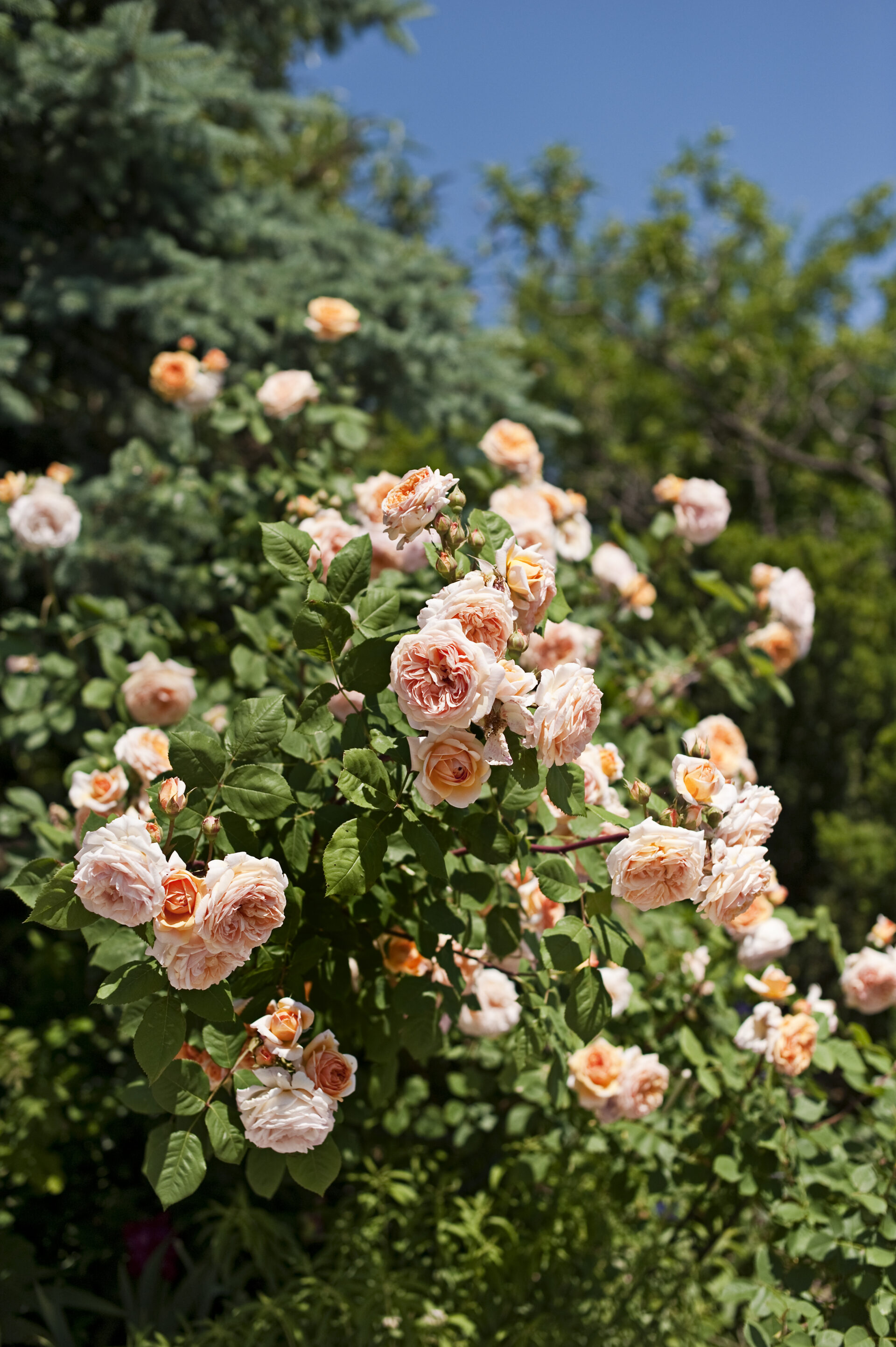 Die Rosenblüte ist in dieser Zeit dicht und vielschichtig. Englische Rosen zeigen ihre weichen, gefüllten Blüten, historische Rosen bringen Tiefe und Charakter, während Ramblerrosen Bögen, Wege und Übergänge begleiten. Der Duft liegt spürbar in der Luft und verändert die Wahrnehmung des Gartens.