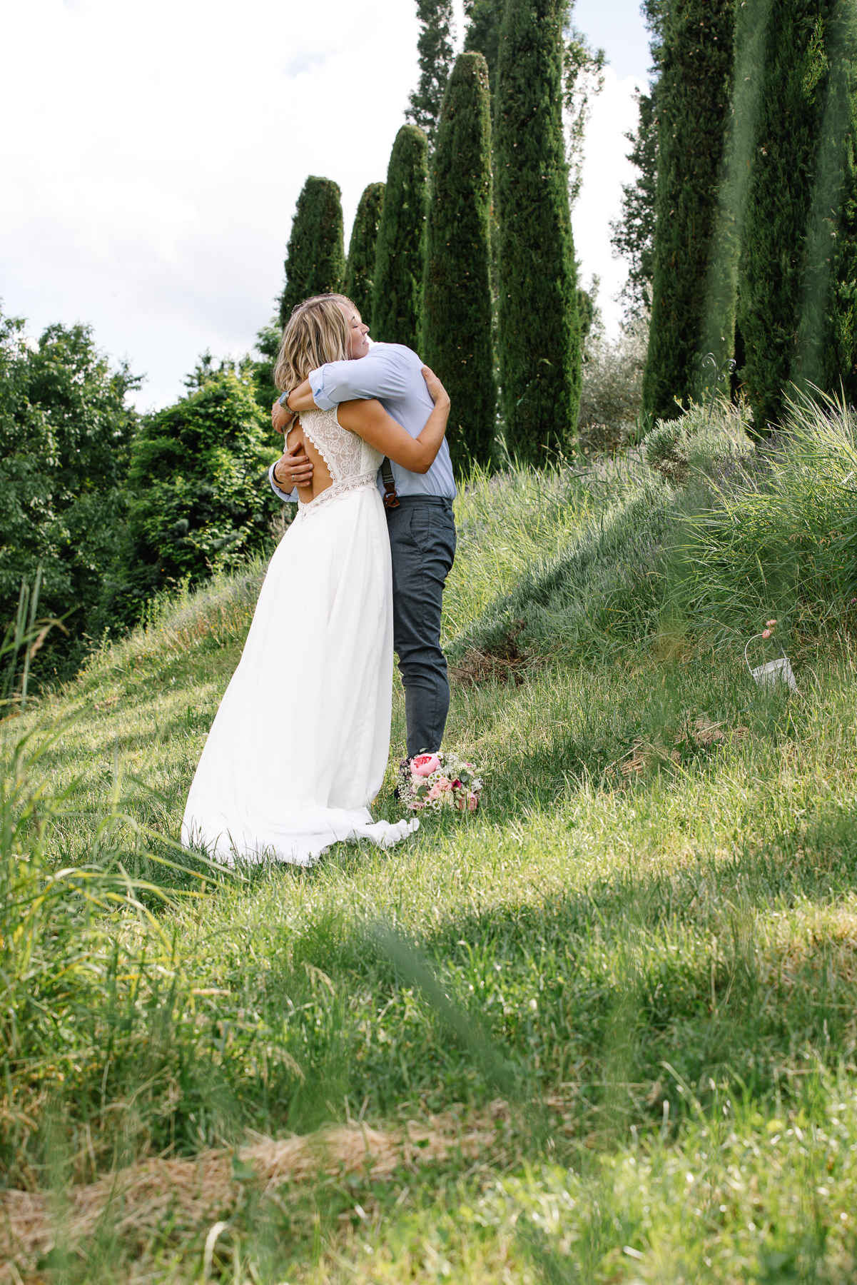 Bei so einer Location lässt sich leicht die rustikale Romantik mit eleganter Leichtigkeit fantastisch für die Ewigkeit in wunderschönen Bildern einfangen. Im Vordergrund die Liebsten und im Hintergrund die sanften Hügel der Weingärten. Das Brautpaar und die Zypressen-Allee, was für ein Zusammenspiel. Nicht umsonst ist die Zypresse sehr beliebt, denn sie symbolisiert den Hochzeitsbaum der Ewigkeit.